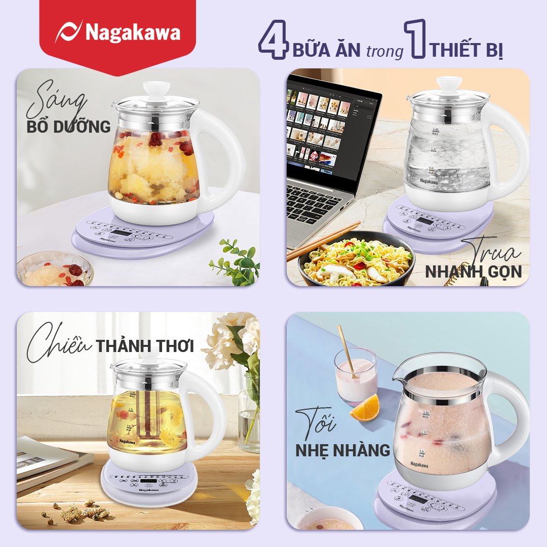 The multifunctional Nagakawa NAG0316 kettle, besides boiling water, integrates 12 convenient functions: brewing various teas, bird's nest stewing, soup cooking, porridge making, egg boiling, milk warming, noodle cooking, syrup stewing, etc. It caters to a wide range of uses, providing rich functionality and helping to reduce the need for multiple appliances and save space.
